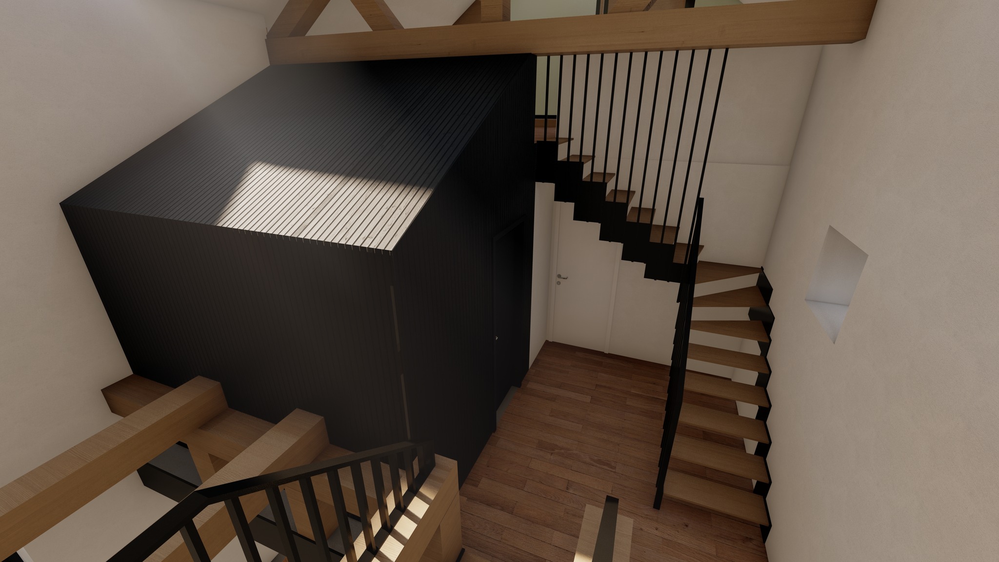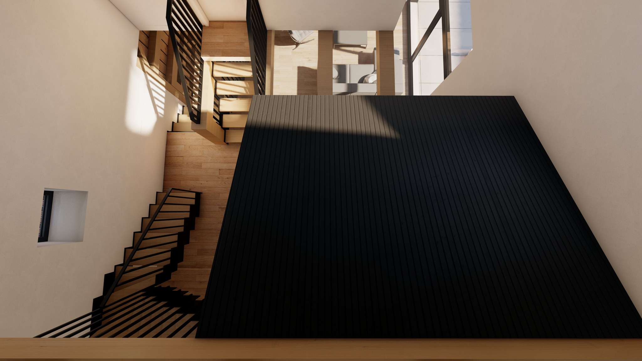 L'espace central reste évidé afin de favoriser la communication entre les différents espaces et l'apport de lumière à tous les niveaux.